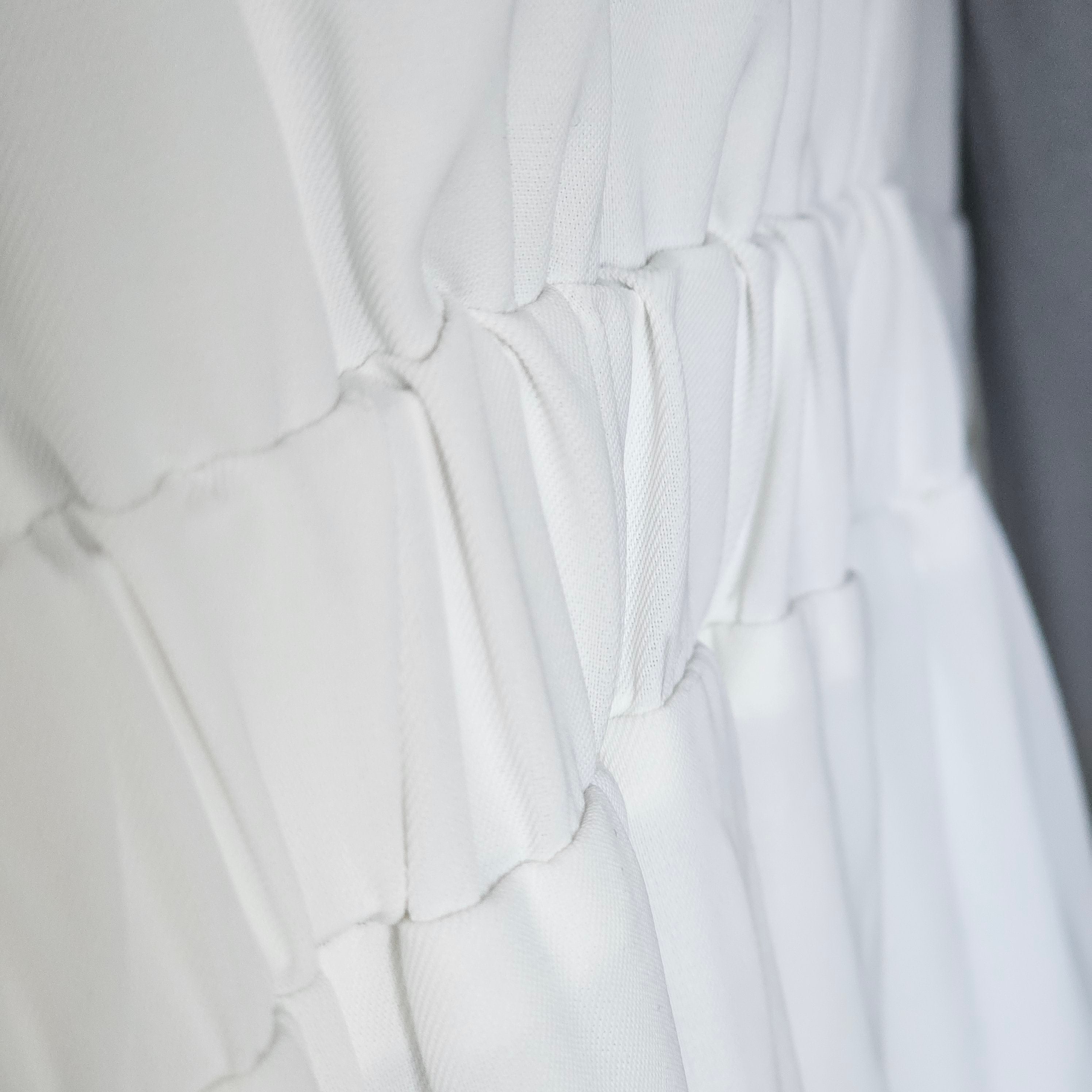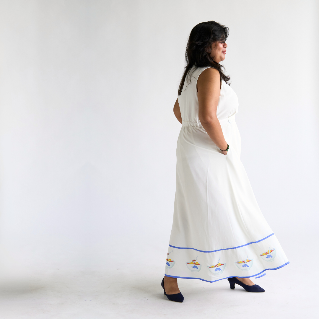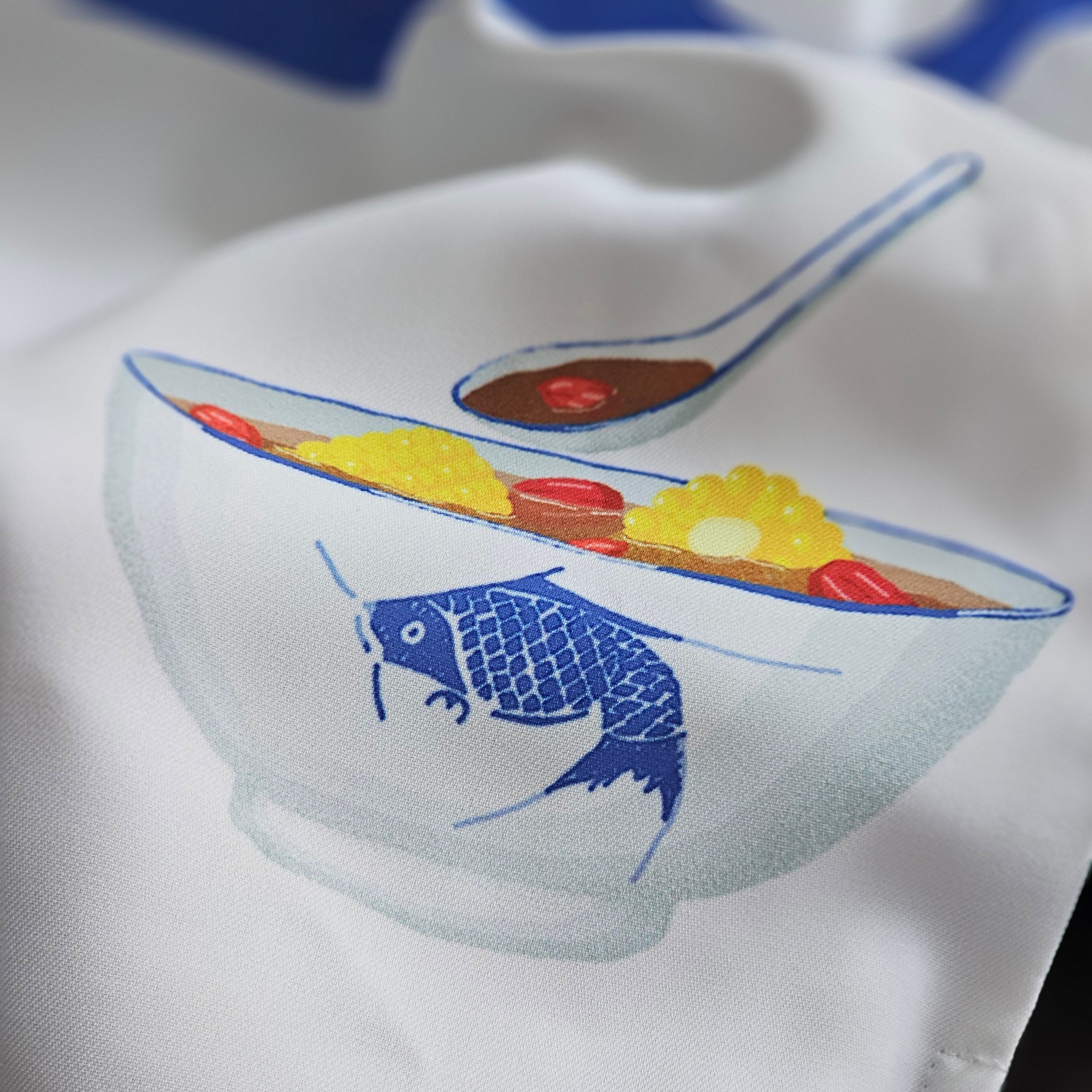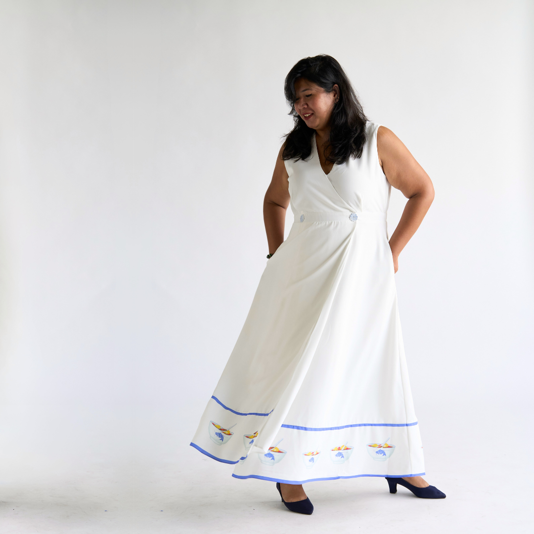Make a statement with the Souper Wrap Dress, a perfect blend of elegance and subtle whimsy. This ankle-length white wrap dress features a tailored fit that flatters every curve, while a delicate Chinese soup motif graces the hem, adding a refined nod to tradition and comfort.